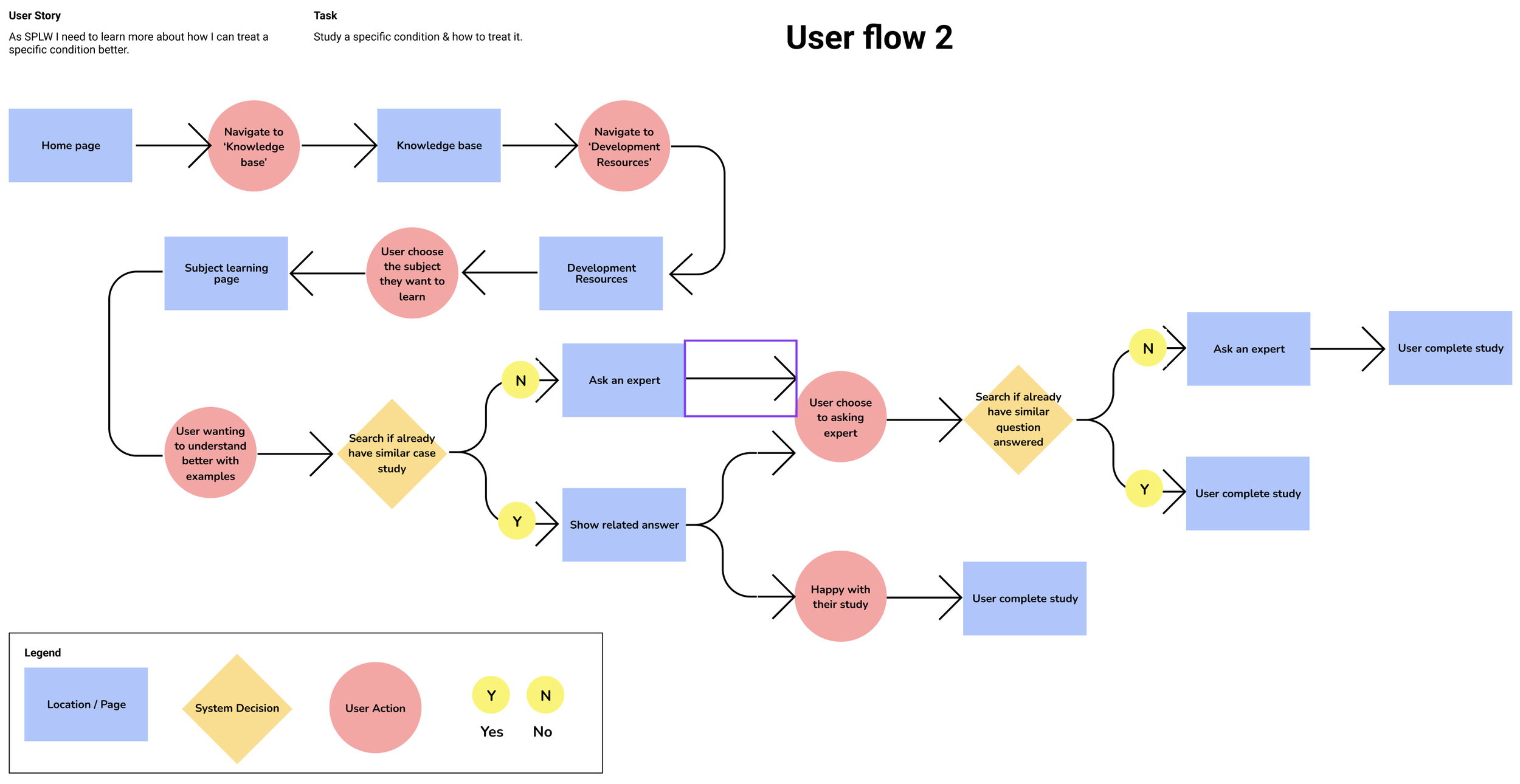 The "In Crisis" Flow (Getting Support): A linear, friction free path designed for high stress moments where a worker needs quick, moderated advice on a challenging case.