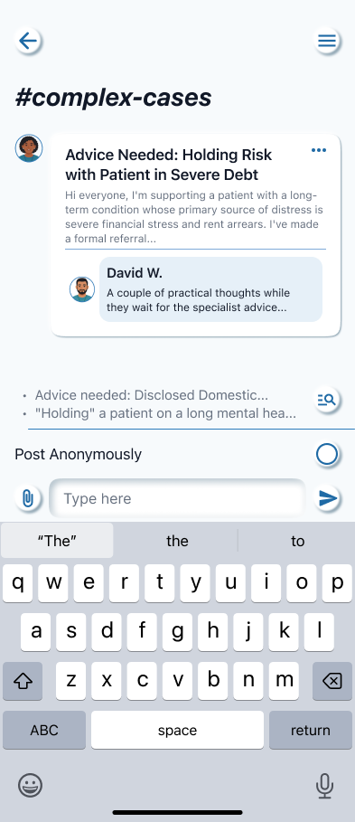 1. Secure Peer Channels Moderated spaces where workers can discuss anonymised cases. To solve the "Governance Anxiety," I designed a "Quick Paste" feature that automatically strips sensitive data patterns (like NHS numbers) to ensure compliance before a message is sent.
