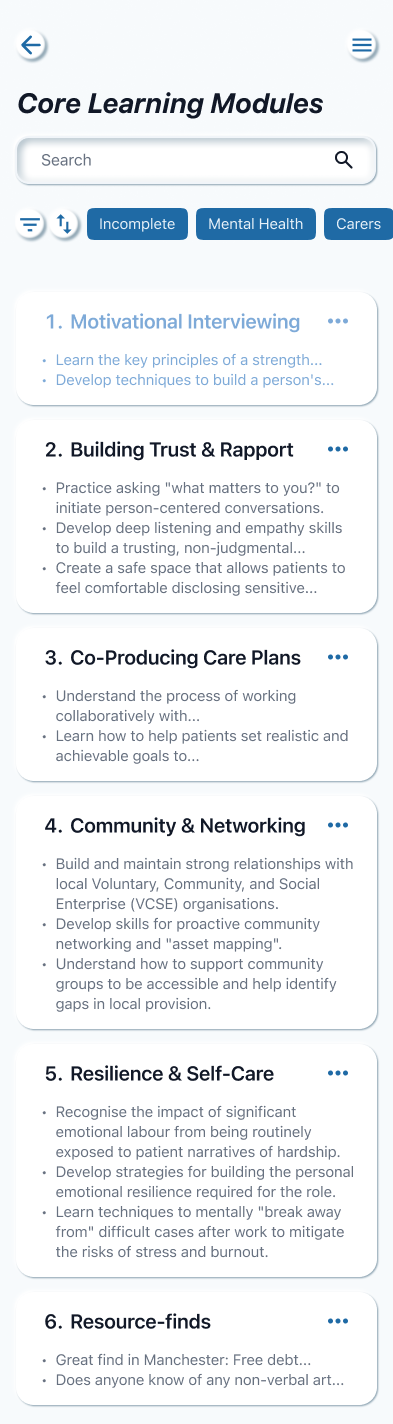 Structured Learning Cards: For the Resource Library, I moved away from dense text blocks. Instead, I used card based layouts with clear progress indicators ("Incomplete" / "Complete") and integrated media players. This attention to layout ensures that professional development feels bite sized and achievable, rather than an administrative chore.